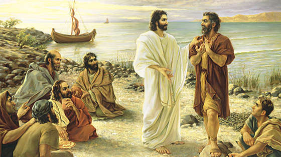 Khi các môn đệ ăn xong, Đức Giêsu hỏi ông Simôn Phêrô: “Này anh Simôn, con ông Gioan, anh có mến Thầy hơn các anh em này không?” Ông đáp: “Thưa Thầy có, Thầy biết con yêu mến Thầy.” Đức Giêsu nói với ông: “Hãy chăm sóc chiên con của Thầy”. Người lại hỏi: “Này anh Simôn, con ông Gioan, anh có mến Thầy không?” Ông đáp: “Thưa Thầy có, Thầy biết con yêu mến Thầy”. Người nói: “Hãy chăn dắt chiên của Thầy”. Người hỏi lần thứ ba: “Này anh Simôn, con ông Gioan, anh có yêu mến Thầy không?” Ông Phêrô buồn vì Người hỏi tới ba lần: Anh có yêu mến Thầy không? Ông đáp: “Thưa Thầy, Thầy biết rõ mọi sự; Thầy biết con yêu mến Thầy”. Đức Giêsu bảo: “Hãy chăm sóc chiên của Thầy. Thật, Thầy bảo thật cho anh biết: lúc còn trẻ, anh tự mình thắt lưng lấy, và đi đâu tuỳ ý. Nhưng khi đã về già, anh sẽ phải dang tay ra cho người khác thắt lưng và dẫn anh đến nơi anh chẳng muốn”. Người nói vậy, có ý ám chỉ ông sẽ phải chết cách nào để tôn vinh Thiên Chúa. Thế rồi, Người bảo ông: “Hãy theo Thầy”