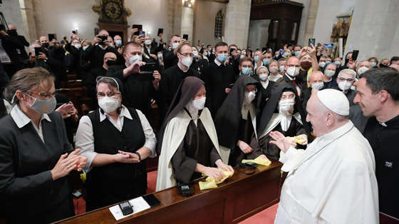 Sau khi gặp chính quyền, xã hội dân sự và ngoại giao đoàn tại Dinh Tổng Thống, Đức Thánh Cha di chuyển bằng xe đến Nhà thờ Chính tòa thánh Martino cách đó 2km để gặp các Giám mục, linh mục, tu sĩ nam nữ, chủng sinh và giáo lý viên của Slovakia.