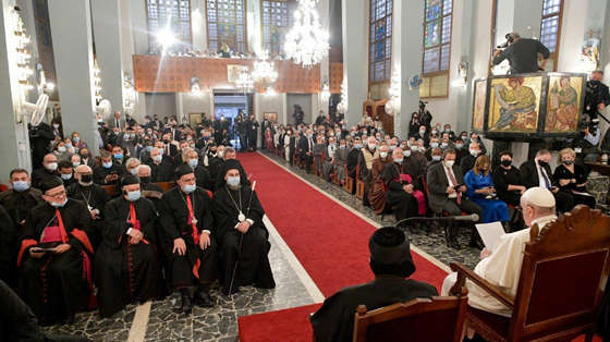 Sau khi được chào đón chính thức tại sân bay quốc tế Larnaca, vào lúc 16:00 giờ thứ Năm 02/12/2021, Đức Thánh Cha đến Nhà thờ Chính tòa Maronite Đức Mẹ Ban Ơn ở Nicosia, để gặp các linh mục, tu sĩ nam nữ, phó tế, giáo lý viên, các hiệp hội và phong trào của Giáo hội Sýp.