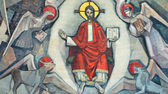 Đức Giêsu ở giữa biểu tượng của 4 Thánh sử, tranh của Fidel Trias Pages và Raimon Roca, năm 1966 tại Nhà thờ Santuario Maria Auxiliadora i Sant Josep ở Barcelona, Tây Ban Nha.
