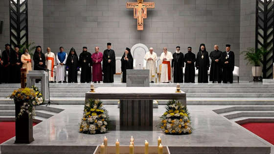 Sau buổi gặp gỡ với các thành viên của “Hội Đồng Bô Lão Hồi Giáo” tại Đền thờ Hồi giáo của Dinh Hoàng gia Sakhir, Đức Thánh Cha đã di chuyển bằng xe đến Nhà thờ Chính toà Đức Mẹ Arập cách đó 1km để tham dự buổi gặp gỡ đại kết và cầu nguyện cho hoà bình.