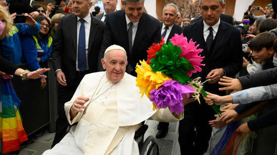 Các học sinh và giáo viên được Đức Thánh Cha tiếp kiến là các tham dự viên của buổi gặp gỡ về giáo dục hoà bình và chăm sóc do Mạng lưới Quốc gia của các Trường học vì Hoà bình tổ chức.