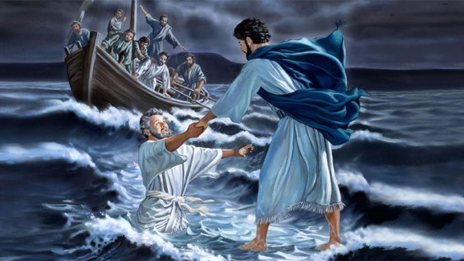 Canh tư đêm tối, Người đi trên mặt biển mà đến với các ông. Thấy Người đi trên mặt biển, các ông hoảng hồn mà nói rằng: “Ma kìa!”, và các ông sợ hãi kêu la lớn tiếng. Lập tức, Chúa Giêsu nói với các ông rằng: “Hãy yên tâm. Thầy đây, đừng sợ!” Phêrô thưa lại rằng: “Lạy Thầy, nếu quả là Thầy, thì xin truyền cho con đi trên mặt nước mà đến cùng Thầy”. Chúa phán: “Hãy đến!” Phêrô xuống khỏi thuyền, bước đi trên mặt nước mà đến cùng Chúa Giêsu. Khi thấy gió mạnh, ông sợ hãi và sắp chìm xuống nên la lên rằng: “Lạy Thầy, xin cứu con!” Lập tức, Chúa Giêsu giơ tay nắm lấy ông mà nói: “Người hèn tin, tại sao mà nghi ngờ?” Khi cả hai đã lên thuyền thì gió liền yên lặng. Những người ở trong thuyền đến lạy Người mà rằng: “Thật, Thầy là Con Thiên Chúa”.