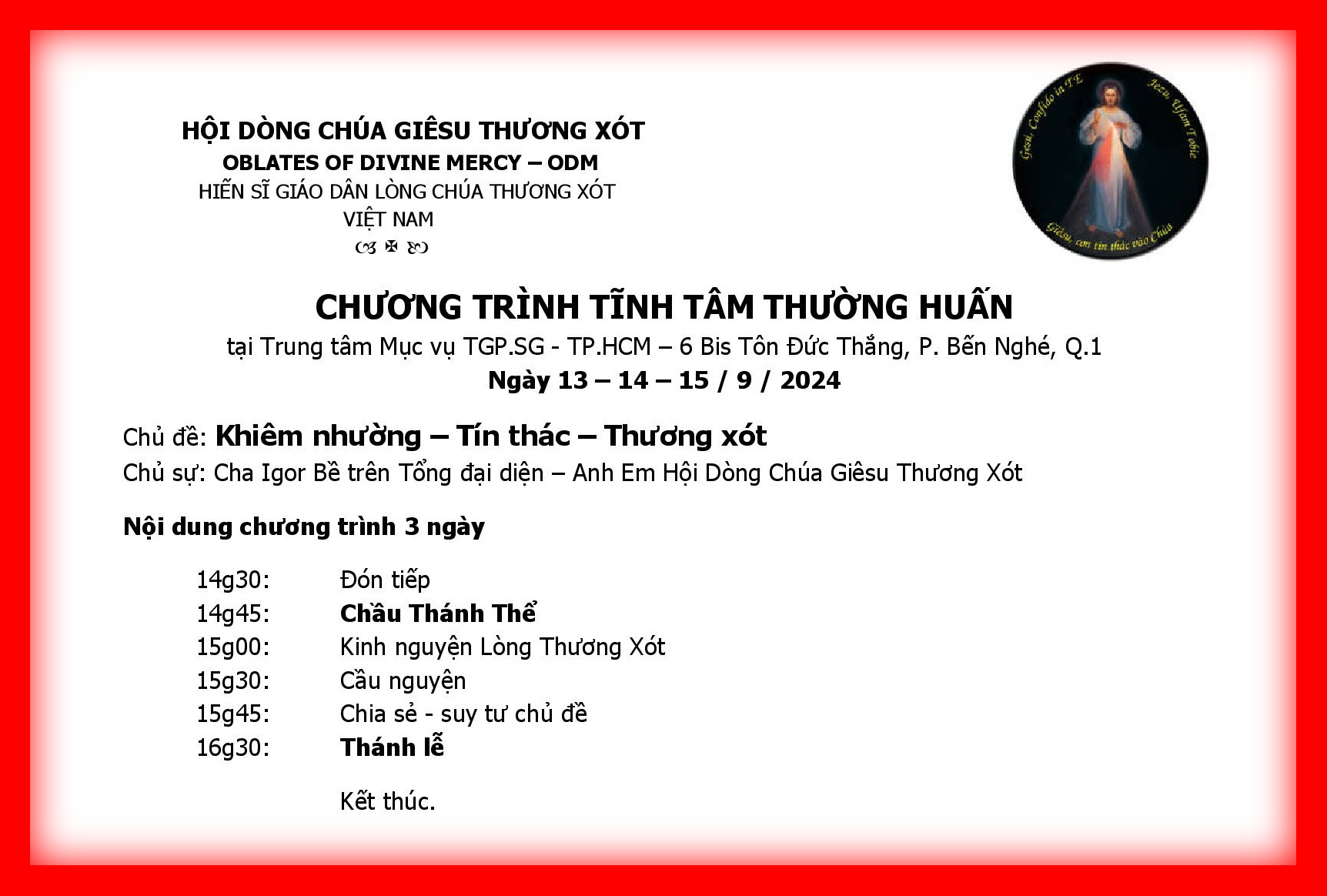 CHƯƠNG TRÌNH TĨNH TÂM THƯỜNG HUẤN THÁNG 9/2024 7 Tháng 10, 2024 admin Thông tin Hội Dòng, Tiêu điểm, Tin mới cập nhật 0